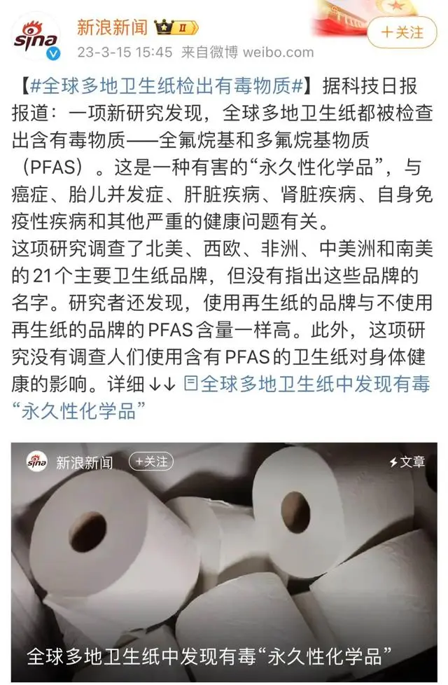 In 2023. According to the 《Science and Technology Daily》 report, Have research found that, Many country barthroom tissue after test contain toxic substances perfluoroalkyl and polyfluoroalkyl(PFAS), And PFAS may increase the incidence of various cancers such as lung cancer and bowel cancer add 59% and may even reduce femail fertility by 40%.